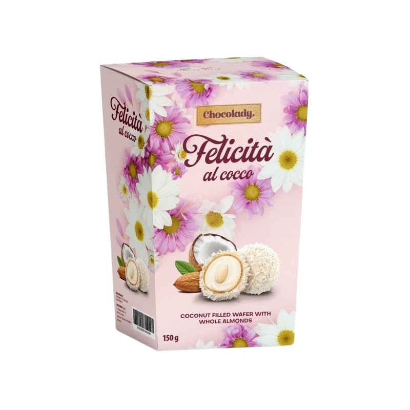 Felicitá al coco oblátky plnené kokosovým krémom s celou mandľou, posypané strúhaným kokosom.